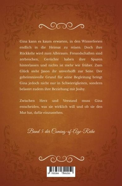 Gina kann es kaum erwarten, in den Winterferien endlich in die Heimat zu reisen. Doch ihre Rückkehr wird zum Albtraum. Freundschaften sind zerbrochen, Gerüchte haben ihre Spuren hinterlassen und nichts ist mehr wie früher. Zum Glück steht Jason ihr unverhofft zur Seite. Der geheimnisvolle Grund für seine Begleitung bringt Gina jedoch nicht nur in Schwierigkeiten, sondern belastet zudem ihre Beziehung mit Joshy.Zwischen Herz und Verstand muss Gina entscheiden, was sie wirklich will und ob sie den Mut hat, dafür einzustehen.Band 5 der Coming-of-Age-Reihe