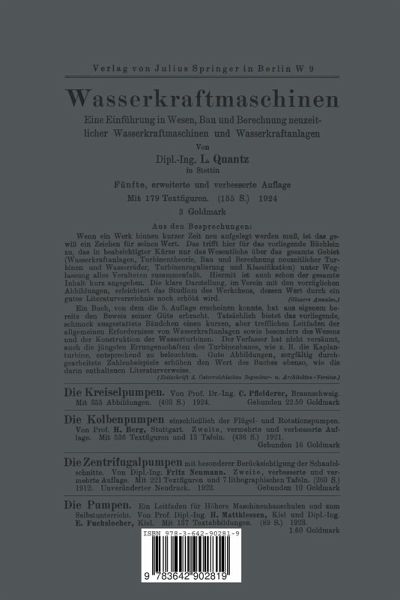 I. Allgemeines über Kreiselpumpen.- 1. Wirkungsweise. - Vorteile und Nachteile.- 2. Einteilung der Kreiselpumpen.- II. Berechnung von Kreiselpumpen und die Schaufelkonstruktion.- 3. Wasserbewegung in Kreiselpumpen.- 4. Hauptgleichung der Kreiselpumpe.- 5. Laufradschaufeln.- 6. Leitradschaufeln.- 7. Allgemeine Berechnungsangaben.- 8. Berechnung von Kreiselpumpen.- III. Bau der Kreiselpumpen und ihrer Einzelteile.- 9. Gewöhnliche Kreiselpumpen ohne Leitrad.- 10. Einstufige Leitrad-Kreiselpumpen oder Turbinenpumpen.- 11. Mehrstufige Turbinenpumpen.- 12. Selbstansaugende Kreiselpumpen.- IV. Verhalten der Kreiselpumpen im Betriebe.- 13. Allgemeines Verhalten der Kreiselpumpen.- 14. Kennlinien.- 15. Regelung der Kreiselpumpen.- V. Ausführungsbeispiele von Kreiselpumpenanlagen.- 16. Wasserversorgungsanlagen.- 17. Hauswasserversorgung.- 18. Bergwerkswasserhaltungen.- 19. Kesselspeise- und Preßwasseranlagen.- 20. Entwässerungsanlagen.