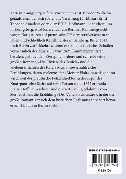 1776 in Königsberg auf die Vornamen Ernst Theodor Wilhelm getauft, nennt er sich später aus Verehrung für Mozart Ernst Theodor Amadeus oder kurz E.T.A. Hoffmann. Er studiert Jura in Königsberg, wird Referendar am Berliner Kammergericht, wegen Karikaturen auf preußische Offiziere strafversetzt nach Polen und schließlich Kapellmeister in Bamberg. Bis er 1814 nach Berlin zurückkehrt widmet er sein künstlerisches Schaffen vornehmlich der Musik. Er wird zum Kammergerichtsrat berufen, gründet den "Serapinenorden" und schreibt seine großen Romane, "Die Elixiere des Teufels" und die "Lebensansichten des Katers Murr", sowie zahlreiche Erzählungen, deren vorletzte, der "Meister Floh", beschlagnahmt wird, weil der preußische Polizeidirektor in der Figur des Knarrpanti eine Satire auf seine Person sieht. 1822 erkrankt E.T.A. Hoffmann schwer und diktiert - völlig gelähmt - vom Sterbebett aus die Erzählung "Des Vetters Eckfenster", in der der große Romantiker sich dem kritischen Realismus annähert bevor er am 25. Juni in Berlin stirbt.