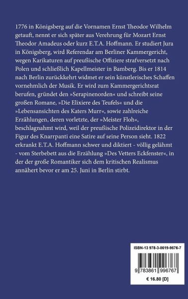 1776 in Königsberg auf die Vornamen Ernst Theodor Wilhelm getauft, nennt er sich später aus Verehrung für Mozart Ernst Theodor Amadeus oder kurz E.T.A. Hoffmann. Er studiert Jura in Königsberg, wird Referendar am Berliner Kammergericht, wegen Karikaturen auf preußische Offiziere strafversetzt nach Polen und schließlich Kapellmeister in Bamberg. Bis er 1814 nach Berlin zurückkehrt widmet er sein künstlerisches Schaffen vornehmlich der Musik. Er wird zum Kammergerichtsrat berufen, gründet den "Serapinenorden" und schreibt seine großen Romane, "Die Elixiere des Teufels" und die "Lebensansichten des Katers Murr", sowie zahlreiche Erzählungen, deren vorletzte, der "Meister Floh", beschlagnahmt wird, weil der preußische Polizeidirektor in der Figur des Knarrpanti eine Satire auf seine Person sieht. 1822 erkrankt E.T.A. Hoffmann schwer und diktiert - völlig gelähmt - vom Sterbebett aus die Erzählung "Des Vetters Eckfenster", in der der große Romantiker sich dem kritischen Realismus annähert bevor er am 25. Juni in Berlin stirbt.