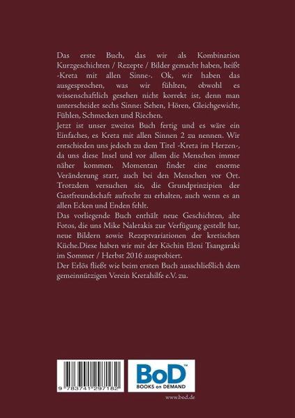 Das erste Buch, das wir als Kombination Kurzgeschichten/Rezepte/Bilder gemacht haben, heißt -Kreta mit allen Sinnen. Ok, wir haben das ausgesprochen, was wir fühlten, obwohl es wissenschaftlich gesehen nicht korrekt ist, denn man unterscheidet sechs Sinne: Sehen, Hören, Gleichgewicht, Fühlen, Schmecken und Riechen.Jetzt ist unser zweites Buch fertig und es wäre ein Einfaches, es Kreta mit allen Sinnen 2 zu nennen. Wir entschieden uns jedoch zu dem Titel -Kreta im Herzen-, da uns diese Insel und vor allem die Menschen immer näher kommen. Momentan findet eine enorme Veränderung statt, auch bei den Menschen vor Ort. Trotzdem versuchen sie, die Grundprinzipien der Gastfreundschaft aufrecht zu erhalten, auch wenn es an allen Ecken und Enden fehlt.Das vorliegende Buch enthält neue Geschichten, alte Fotos, die uns Mike Naletakis zur Verfügung gestellt hat, neue Bildern sowie Rezeptvariationen der kretischen Küche. Diese haben wir mit der Köchin Eleni Tsangaraki im Sommer/Herbst 2016 ausprobiert.Der Erlös fließt wie beim ersten Buch auch ausschließlich dem gemeinnützigen Verein Kretahilfe e.V. zu.