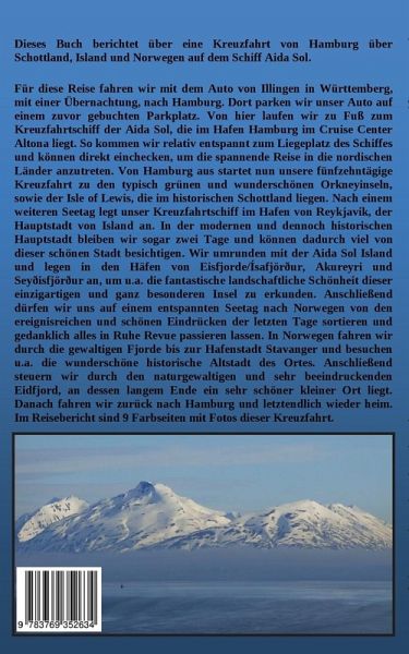 Dieses Buch berichtet über eine Kreuzfahrt von Hamburg über Schottland, Island und Norwegen auf dem Schiff Aida Sol. Für diese Reise fahren wir mit dem Auto von Illingen in Württemberg, mit einer Übernachtung, nach Hamburg. Dort parken wir unser Auto auf einem zuvor gebuchten Parkplatz. Von hier laufen wir zu Fuß zum Kreuzfahrtschiff der Aida Sol, die im Hafen Hamburg im Cruise Center Altona liegt. So kommen wir relativ entspannt zum Liegeplatz des Schiffes und können direkt einchecken, um die spannende Reise in die nordischen Länder anzutreten. Von Hamburg aus startet nun unsere fünfzehntägige Kreuzfahrt zu den typisch grünen und wunderschönen Orkneyinseln, sowie der Isle of Lewis, die im historischen Schottland liegen. Nach einem weiteren Seetag legt unser Kreuzfahrtschiff im Hafen von Reykjavik, der Hauptstadt von Island an. In der modernen und dennoch historischen Hauptstadt bleiben wir sogar zwei Tage und können dadurch viel von dieser schönen Stadt besichtigen. Wir umrunden mit der Aida Sol Island und legen in den Häfen von Eisfjorde/Ísafjörður, Akureyri und Seyðisfjörður an, um u.a. die fantastische landschaftliche Schönheit dieser einzigartigen und ganz besonderen Insel zu erkunden. Anschließend können wir uns auf einem entspannten Seetag nach Norwegen von den ereignisreichen und schönen Eindrücken der letzten Tage ordnen und gedanklich alles in Ruhe Revue passieren lassen. In Norwegen fahren wir durch die gewaltigen Fjorde bis zur Hafenstadt Stavanger und besuchen u.a. die wunderschöne historische Altstadt des Ortes. Anschließend steuern wir durch den naturgewaltigen und sehr beeindruckenden Eidfjord, an dessen langem Ende ein sehr schöner kleiner Ort liegt. Danach fahren wir zurück nach Hamburg und letztendlich wieder heim. Im Reisebericht sind 9 Farbseiten mit Fotos dieser Kreuzfahrt.
