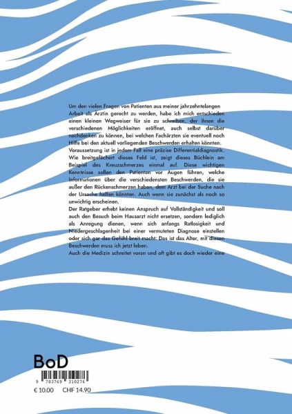 Um den vielen Fragen von Patienten aus meiner jahrzehntelangen Arbeit als Ärztin gerecht zu werden, habe ich mich entschieden einen kleinen Wegweiser für sie zu schreiben, der ihnen die verschiedenen Möglichkeiten eröffnet, auch selbst darüber nachdenken zu können, bei welchen Fachärzten sie eventuell noch Hilfe bei den aktuell vorliegenden Beschwerden erhalten könnten. Voraussetzung ist in jedem Fall eine präzise Differentialdiagnostik. Wie breitgefächert dieses Feld ist, zeigt dieses Büchlein am Beispiel des Kreuzschmerzes einmal auf. Diese wichtigen Kenntnisse sollen dem Patienten vor Augen führen, welche Informationen über die verschiedensten Beschwerden, die er außer den Rückenschmerzen hat, dem Arzt bei der Suche nach der Ursache helfen könnten. Auch wenn sie zunächst als noch so unwichtig erscheinen. Der Ratgeber erhebt keinen Anspruch auf Vollständigkeit und soll auch den Besuch beim Hausarzt nicht ersetzen, sondern lediglich als Anregung dienen, wenn sich anfangs Ratlosigkeit und Niedergeschlagenheit bei einer vermuteten Diagnose einstellen oder sich gar das Gefühl breit macht: Das ist das Alter, mit diesen Beschwerden muss ich jetzt leben. Auch die Medizin schreitet voran und oft gibt es doch wieder eine unerwartete Neuentwicklung oder Alternative. .