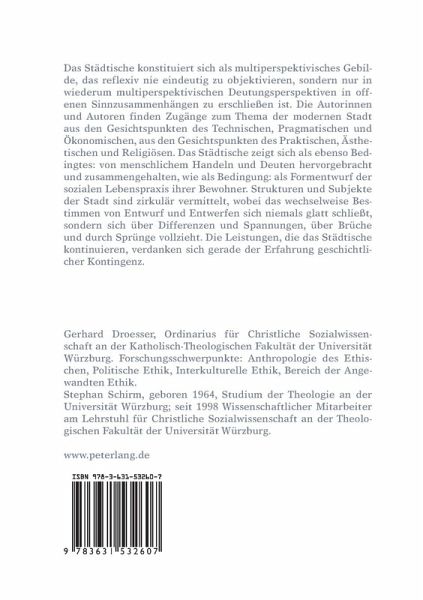 Das Städtische konstituiert sich als multiperspektivisches Gebilde, das reflexiv nie eindeutig zu objektivieren, sondern nur in wiederum multiperspektivischen Deutungsperspektiven in offenen Sinnzusammenhängen zu erschließen ist. Die Autorinnen und Autoren finden Zugänge zum Thema der modernen Stadt aus den Gesichtspunkten des Technischen, Pragmatischen und Ökonomischen, aus den Gesichtspunkten des Praktischen, Ästhetischen und Religiösen. Das Städtische zeigt sich als ebenso Bedingtes: von menschlichem Handeln und Deuten hervorgebracht und zusammengehalten, wie als Bedingung: als Formentwurf der sozialen Lebenspraxis ihrer Bewohner. Strukturen und Subjekte der Stadt sind zirkulär vermittelt, wobei das wechselweise Bestimmen von Entwurf und Entwerfen sich niemals glatt schließt, sondern sich über Differenzen und Spannungen, über Brüche und durch Sprünge vollzieht. Die Leistungen, die das Städtische kontinuieren, verdanken sich gerade der Erfahrung geschichtlicher Kontingenz.