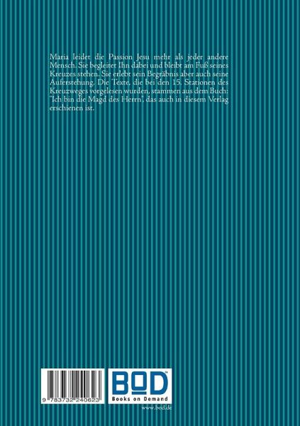 Maria leidet die Passion Jesu mehr als jeder andere Mensch. Sie begleitet Ihn dabei und bleibt am Fuß seines Kreuzes stehen. Sie erlebt sein Begräbnis aber auch seine Auferstehung. Die Texte, die bei den 15. Stationen des Kreuzweges vorgelesen werden, stammen aus dem Buch: "Ich bin die Magd des Herrn", das auch in diesem Verlag erschienen ist.