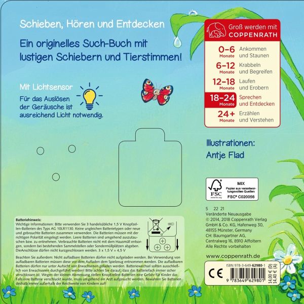 Schieb mal, hör mal!Auf jeder Seite versteckt sich ein anderes Tier.Bewege den Schieber und wie von Zauberhand begrüßt dich jedes Tier mit dem passenden Geräusch.Ein originelles Such-Buch mit spannenden Schiebern und Geräuschen!