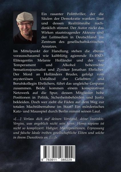 Ein rasanter Politthriller, der die Säulen der Demokratie wanken lässt und dessen Realitätsnähe nachdenklich stimmt. Der Autor rückt das Wirken staatstragender Akteure und der Leitmedien in Deutschland ins Zentrum des gesellschaftskritischen Ansatzes.Im Mittelpunkt der Handlung stehen die ebenso vorausschauend wie kaltblütig agierende Ex-BND-Eliteagentin Melanie Holländer und der von Temperament und Alkohol beherrschte Sensationsjournalist und Zyniker Jonathan Ehrlicher. Der Mord an Holländers Bruder, gefolgt vom mysteriösen Unfalltod der Geliebten und Berufskollegin Ehrlichers, führt das ungleiche Gespann zusammen. Beide kommen einem konspirativen Netzwerk auf die Spur, dessen Mitglieder hohe Positionen in Politik, Sicherheitsbehörden und Justiz bekleiden. Doch wer zieht die Fäden auf dem Weg zur totalen Machtübernahme im Staat? Ein mörderisches Katz- und Mausspiel durch Berlin nimmt seinen Lauf.»[...] Verlass dich auf deinen Verstand, deine Instinkte. Vergiss, was angeblich nicht sein kann. Homo sapiens ist nicht so kompliziert. Habgier, Machtpositionen, Erpressung und falsche Ideale treiben gesellschaftliche Eliten und solche in ihrem Dunstkreis an. [...]«