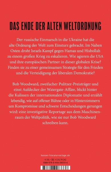Das Ende der alten Weltordnung: Bob Woodward, zweifacher Pulitzer-Preisträger, blickt hinter die Kulissen der internationalen Diplomatie In der Ukraine toben die schwersten Kämpfe auf europäischem Boden seit 1945, in Israel ist ein Ende der Gewalt nicht abzusehen. Beide Kriege drohen sich zu größeren internationalen Konflikten auszuweiten. Die alte Weltordnung ist offensichtlich an ein Ende gekommen. Wie agieren die USA und der Westen in diesen geopolitischen Krisen? Welche Konflikte warten auf die nächste US-Präsidentschaft? Bob Woodward, zweifacher Pulitzer-Preisträger und einst Aufdecker der Watergate-Affäre, gibt einmalige Einblicke hinter die Kulissen der internationalen Politik: Telefonate zwischen Putin und Biden, hektische Diplomatie in Hinterzimmern, gewagte Geheimdienstoperationen. Sein Buch nimmt uns mit an die entscheidenden Schauplätze der Gegenwart und vermittelt ein Gefühl für die Komplexität und das Risiko politischer Entscheidungen in Zeiten des Krieges. Eine investigative Reportage aus dem Maschinenraum der Diplomatie, wie sie nur Bob Woodward schreiben kann.