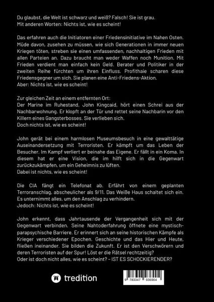 Du glaubst, die Welt ist schwarz und weiß? Falsch! Sie ist grau. Mit anderen Worten: Nichts ist, wie es scheint!Das erfahren auch die Initiatoren einer Friedensinitiative im Nahen Osten. Müde davon, zusehen zu müssen, wie sich Generationen in immer neuen Kriegen töten, streben sie einen umfassenden, nachhaltigen Frieden mit allen Parteien an. Dazu braucht man weder Waffen noch Munition. Mit Frieden verdient man einfach kein Geld. Berater und Politiker in der zweiten Reihe fürchten um ihren Einfluss. Profithaie scharen diese Friedensgegner um sich. Sie planen eine Anti-Friedens-Aktion. Aber: Nichts ist, wie es scheint!Zur gleichen Zeit an einem entfernten Ort: Der Marine im Ruhestand, John Kingcaid, hört einen Schrei aus der Nachbarwohnung. Er klopft an der Tür und rettet seine Nachbarin vor den Killern eines Gangsterbosses. Sie verlieben sich.Doch nichts ist, wie es scheint!John gerät bei einem harmlosen Museumsbesuch in eine gewalttätige Auseinandersetzung mit Terroristen. Er kämpft um das Leben der Besucher. Im Kampf verliert er beinahe das Eigene. Er fällt in ein Koma. In diesem hat er eine Vision, die im hilft sich in die Gegenwart zurückzukämpfen, um ein Geheimnis zu lüften.Dabei ist nichts, wie es scheint!Die CIA fängt ein Telefonat ab. Erfährt von einem geplanten Terroranschlag, abscheulicher als 9/11. Das Weiße Haus schaltet sich ein. Es unternimmt alles, um den Anschlag zu verhindern.Jedoch: Nichts ist, wie es scheint!John erkennt, dass Jahrtausende der Vergangenheit sich mit der Gegenwart verbinden. Seine Nahtoderfahrung öffnete eine mystisch-parapsychische Barriere. Er erinnert sich an seine historischen Kämpfe als Krieger verschiedener Epochen. Die Vergangenheit und die Gegenwart, fließen ineinander. Sie bilden die Zukunft. Er ist den Verschwörern und deren Terroristen auf der Spur! Löst er die Rätsel rechtzeitig?Oder ist doch nicht alles, wie es scheint? - IST ES SCHOCKIERENDER?!