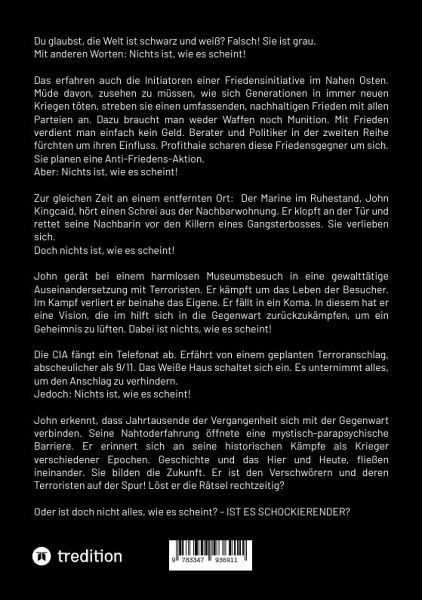 Du glaubst, die Welt ist schwarz und weiß? Falsch! Sie ist grau. Mit anderen Worten: Nichts ist, wie es scheint!Das erfahren auch die Initiatoren einer Friedensinitiative im Nahen Osten. Müde davon, zusehen zu müssen, wie sich Generationen in immer neuen Kriegen töten, streben sie einen umfassenden, nachhaltigen Frieden mit allen Parteien an. Dazu braucht man weder Waffen noch Munition. Mit Frieden verdient man einfach kein Geld. Berater und Politiker in der zweiten Reihe fürchten um ihren Einfluss. Profithaie scharen diese Friedensgegner um sich. Sie planen eine Anti-Friedens-Aktion. Aber: Nichts ist, wie es scheint!Zur gleichen Zeit an einem entfernten Ort: Der Marine im Ruhestand, John Kingcaid, hört einen Schrei aus der Nachbarwohnung. Er klopft an der Tür und rettet seine Nachbarin vor den Killern eines Gangsterbosses. Sie verlieben sich.Doch nichts ist, wie es scheint!John gerät bei einem harmlosen Museumsbesuch in eine gewalttätige Auseinandersetzung mit Terroristen. Er kämpft um das Leben der Besucher. Im Kampf verliert er beinahe das Eigene. Er fällt in ein Koma. In diesem hat er eine Vision, die im hilft sich in die Gegenwart zurückzukämpfen, um ein Geheimnis zu lüften.Dabei ist nichts, wie es scheint!Die CIA fängt ein Telefonat ab. Erfährt von einem geplanten Terroranschlag, abscheulicher als 9/11. Das Weiße Haus schaltet sich ein. Es unternimmt alles, um den Anschlag zu verhindern.Jedoch: Nichts ist, wie es scheint!John erkennt, dass Jahrtausende der Vergangenheit sich mit der Gegenwart verbinden. Seine Nahtoderfahrung öffnete eine mystisch-parapsychische Barriere. Er erinnert sich an seine historischen Kämpfe als Krieger verschiedener Epochen. Die Vergangenheit und die Gegenwart, fließen ineinander. Sie bilden die Zukunft. Er ist den Verschwörern und deren Terroristen auf der Spur! Löst er die Rätsel rechtzeitig?Oder ist doch nicht alles, wie es scheint? - IST ES SCHOCKIERENDER?!