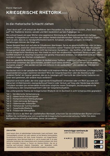 In die rhetorische Schlacht ziehen"Pass' doch auf!", ruft erbost der Radfahrer dem Passanten zu. Dieser schreit zurück: "Pass' doch selber auf!" Der Radfahrer bremst, wendet und fährt bedrohlich auf den Fußgänger zu.Wie schnell bauen ein paar Wörter eine aggressive Stimmung auf. Ruckzuck entsteht ein heftiger verbaler Schlagabtausch zwischen den beiden Verkehrsteilnehmenden. Können sie sich nicht zügeln, kann es sein, dass es zu Handgreiflichkeiten kommt. Schubsen, schlagen, prügeln. Ernsthafte Verletzungen können die Folge sein.Dieses Beispiel lässt sich auf allerlei Situationen übertragen. Sei es im gesellschaftlichen oder im beruflichen Umfeld, sowie bei unterschiedlichen Ansichten zweier Staaten auf dieser Welt. Wie die jüngste Vergangenheit zeigt, bleibt es dann nicht bei kleineren Rangeleien - der Konflikt artet, läuft alles schief, in eine kriegerische Handlung aus. Hier bleibt es nicht bei vergleichbar harmlosen Verletzungen - der Konflikt eskaliert in bösartige körperlich wie geistig irreparable Schäden, tja tatsächlich wird das Töten und damit sogar das Sterben einkalkuliert.Wird der gewählte Wortschatz - schon im Vorfeld eines Treffens - analysiert, offenbaren sich nicht nur bestimmte Gedanken des Sprechenden, sondern auch seine Strategie. "Denen werden wir es erbarmungslos zeigen!" "Das werden wir bis zum bitteren Ende ausfechten!" "Die werden wir mit eigenen Waffen schlagen."Verstecken sich in der geäußerten Wortwahl nicht mehrere Wörter, die aus feindlichen, ja kriegerischen Auseinandersetzungen stammen könnten? Wird der Gesprächspartner oder die Abordnung der 'anderen Partei' als Gegner gesehen, den es zu besiegen gilt? Herrscht der (überholte) Gedanke vor: Einer wird gewinnen, der andere muss verlieren?Natürlich wird nicht jeder, der eine sogenannte Kriegsfloskel verwendet oder ein Wort aus dem militärischen Umfeld benutzt, zwangsläufig auf Gewinn oder Verlust, auf Sieg oder Niederlage abzielen. Trotzdem verraten die verwendeten Ausdrücke mögliche innere Strategien, beziehungsweise die Einstellung zu den Gesprächspartnern oder der Gesprächssituation.1 - Verräterische Verbalisierung2 - Abwertende Körpersignale3 - Kompromisslose Behauptungen4 - Unterstellende Befragung 5 - Ablenkendes Antworten6 - Hemmende Kommunikation7 - Gewaltvolle Rhetorik8 - Fröstelnde AtmosphäreTreten Sie ein in die Welt der zweifelhaften Wortwahl, erkennen Sie entstehende Risiken und entkräften Sie eine sich zuspitzende kriegerische Auseinandersetzung.