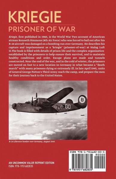 Kriegie: Prisoner of War, first published in 1960, is the World War Two account of American airman Kenneth Simmons (8th Air Force) who was forced to bail out after his aircraft was damaged on a bombing run over Germany. He describes his capture and imprisonment as a 'kriegie' (prisoner-of-war) at Stalag Luft II. The book is filled with details of prison life and the complex organization established by the prisoners to help ensure their survival, and to maintain healthy conditions and order. Escape plans are made and tunnels constructed. Near the end of the war, and in the cold of winter, the prisoners are moved on foot to a new location in Germany in what became a "death march" with many prisoners dying or extremely ill. In late April 1945, units of General George Patton's Third Army reach the camp, and prepare the men for their journey back to the United States.