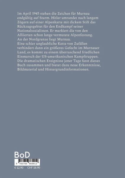 Im April 1945 stehen die Zeichen für Murnau endgültig auf Sturm. Hitler umrandet nach langem Zögern auf einer Alpenkarte mit dickem Stift das Rückzugsgebiet für den Endkampf seiner Nationalsozialisten. Er markiert die von den Alliierten schon lange vermutete Alpenfestung. An der Nordgrenze liegt Murnau.Eine schier unglaubliche Kette von Zufällen verhindert dann ein größeres Gefecht im Murnauer Land, es kommt zu einem überraschend friedlichen Einmarsch der US-amerikanischen Kampftruppen. Die dramatischen Ereignisse jener Tage fasst dieses Buch zusammen und bietet dazu neue Erkenntnisse und Hintergrundinformationen.