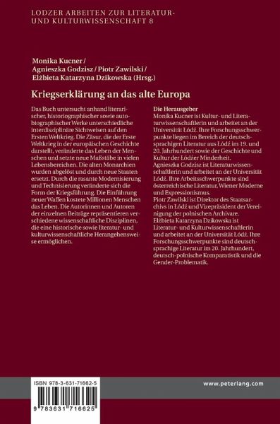 Das Buch untersucht anhand literarischer, historiographischer sowie autobiographischer Werke unterschiedliche interdisziplinäre Sichtweisen auf den Ersten Weltkrieg. Die Zäsur, die der Erste Weltkrieg in der europäischen Geschichte darstellt, veränderte das Leben der Menschen und setzte neue Maßstäbe in vielen Lebensbereichen. Die alten Monarchien wurden abgelöst und durch neue Staaten ersetzt. Durch die rasante Modernisierung und Technisierung veränderte sich die Form der Kriegsführung. Die Einführung neuer Waffen kostete Millionen Menschen das Leben. Die Autorinnen und Autoren der einzelnen Beiträge repräsentieren verschiedene wissenschaftliche Disziplinen, die eine historische sowie literatur- und kulturwissenschaftliche Herangehensweise ermöglichen.