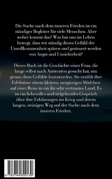 Die Suche nach dem inneren Frieden ist ein ständiger Begleiter für viele Menschen. Aber woher kommt das? Was hat uns im Leben bewegt, dass wir ständig dieses Gefühl der Unvollkommenheit spüren und gesteuert werden von Angst und Unsicherheit?Dieses Buch ist die Geschichte einer Frau, die lange selbst nach Antworten gesucht hat, um genau diese Gefühle loszuwerden. Sie erzählt ihre Erlebnisse einem kleinen, neugierigen Mädchen auf einer Reise in ein ihr sehr vertrautes Land. Es ist ein liebevolles und tiefgehendes Gespräch über ihre Erfahrungen im Krieg und ihrem langen, steinigen Weg auf der Suche nach dem inneren Weg.