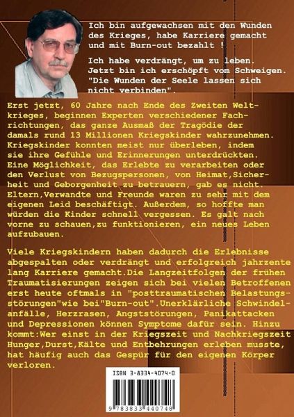 Ich bin aufgewachsen mit den Wunden des Krieges. Habe mit drei Jahren den Himmel brennen gesehen. Habe im Bunker ¿Marke Eigenbaü Luftangriffe überstanden. Invaliden ohne Arme, ohne Beine nahmen ihre Glasaugen heraus um mich zu erschrecken. Heute muß ich sagen: ¿Mich hat der Krieg in kurzer Zeit zu einem Profi des Schreckens erzogen, in der die Wirklichkeit auch mit den heutigen schlimmsten PC-Gams mithalten kann¿. ¿Zu meinem Alltag gehörten die Begriffe wie Luftmine oder Stabbombe so selbstverständlich wie die Kids vom Handy oder Gameboy reden¿. Als Generation der Kriegs- und Trümmerkinder lebte ich mit meinen Eltern in Westberlin und habe die Berlin Blockade mit Hunger und Kälte erlebt. Ich habe im Wald Beeren, Blätter und Gräser gegessen und mit Tränen in den Augen am Flugfeld Tegel die Landungen der ¿Rosinenbomber¿ erwartungsvoll zugesehen. Erst jetzt, 60 Jahre nach Ende des Zweiten Weltkrieges, beginnen Experten verschiedener Fachrichtungen, das ganze Ausmaß der Tragödie der damals rund 13 Millionen Kriegskinder wahrzunehmen. Kriegskinder konnten meist nur überleben, indem sie ihre Gefühle und Erinnerungen unterdrückten.