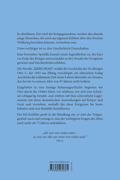 In absehbarer Zeit wird die Kriegsgeneration, werden also damals junge Menschen, die noch aus eigenem Erleben über den Zweiten Weltkrieg berichten können, verstorben sein.Umso wichtiger ist es, ihre Geschichte(n) festzuhalten. Eine besondere Spezifik kommt jenen Jugendlichen zu, die kurzvor Ende des Krieges unverschuldet in den Strudel der Ereignisse gerieten und Fürchterliches erlebten.Die Novelle "KRIEGSRAD" erzählt die Geschichte des 16-jährigen Otto S., der 1945 aus Elbing verschleppt, im sibirischen Gulag Anscherka die schlimmste Zeit seines Lebens übersteht, ein Trauma, das ihn bis zu seinem Alter von 93 Jahren nicht loslässt. Eingebettet in eine heutige Rahmengeschichte begleiten wir Otto durch die 1940er-Jahre, wir erfahren, wie sich sein Schicksal schlagartig wendet, und erleben mit ihm schreckliche Lagermonate mit ihren dramatischen Auswirkungen auf Körper und Geist und verstehen, weshalb ihn diese Ereignisse bis heute belasten und sein Handeln beeinflussen.Der Ich-Erzähler greift in die Handlung ein, er reist der Vergangenheit nach und vermag es, eine der wichtigsten Fragen des Alten nach mehr als 75 Jahren aufzuklären.
