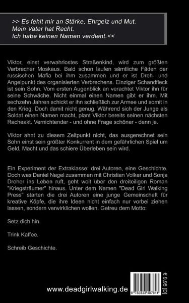 Als geistiger Vater, Gründer und Geschäftsführer ist Daniel Nagel der Mittelpunkt des Teams um Dead Girl Walking Press. Ihm hat der Verein zur Förderung von Jugendkultur durch kreatives Schreiben nicht nur seine Grundsätze, sondern auch seine gesamte Struktur zu verdanken. Nach seinem Dienst als Zeitsoldat nahm er sein derzeitiges Marketingstudium an der VWA Göttingen auf. Zusammen mit seiner Erfahrungen als freier Unternehmensberater ist er somit außerdem der Experte für alle wirtschaftlichen Fragen. Daneben ist Daniel Nagel Thrillerautor und Künstler. Seine erste Veröffentlichung ist die ¿Kriegsträumer¿ Trilogie.