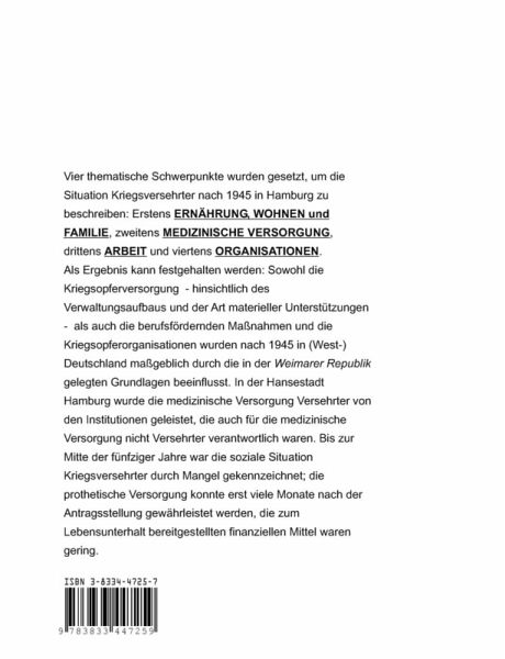 Ein bislang nicht beachtetes Kapitel deutscher Nachkriegsgeschichte erforschte die Hamburger Historikerin Uta Krukowska mit Unterstützung des Instituts für Geschichte und Ethik der Medizin am Universtätsklinikum Hamburg-Eppendorf: Die Situation deutscher Versehrter nach dem Ende des Zweiten Weltkrieges. In Deutschland lebten Mitte der fünfziger Jahre eineinhalb Millionen staatlich anerkannte Kriegsversehrte; Männer, Frauen und Kinder. Ihre Situation umreißt die o.g. Veröffentlichung, in deren Mittelpunkt die Verhältnisse in der zur Britischen Besatzungszone gehörenden Hansestadt Hamburg stehen. In Hamburg waren Mitte der vierziger Jahre mehr als dreißigtausend Versehrte ansässig. Die Veröffentlichung setzt vier thematische Schwerpunkte, um die Situation Versehrter nach 1945 in der Hansestadt zu beschreiben. Eingegangen wird auf die Ernährungs- und Wohnsituation ebenso wie auf die medizinische Versorgung von Kriegsversehrten und ihre Chancen auf dem Arbeitsmarkt. Auch die Kriegsversehrtenorganisationen werden angesprochen.