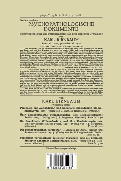 Inhaltsübersicht.- Das Gebiet der Kriminalpsychopathologie.- 1. Kapitel: Allgemeine Grundlagen der Kriminalpsychopathologie.- 2. Kapitel: Die kriminalpsychopathologischen Grundphänomene.- 1. Kapitel: Kriminalpathologie der Symptomenkomplexe.- 2. Kapitel: Kriminalpathologie der psychischen Krankheitstypen.- 3. Kapitel: Milieu und pathologisch bedingte Kriminalität.- 1. Kapitel: Allgemeine Orientierung.- 2. Kapitel: Die Verbrechens- und Verbrechertypen vom psychopathologischen Gesichtspunkt.- 3. Kapitel: Die jugendlichen Kriminellen und Verwahrlosten.- 4. Kapitel: Die weiblichen Kriminellen.- 5. Kapitel: Das naturwissenschaftliche Verbrecherproblem.- 1. Kapitel: Allgemeine Psychopathologie der Haft.- 2. Kapitel: Die Geistesstörungen der Haft.- 3. Kapitel: Die Simulationsfrage.- 4. Kapitel: Die Strafbehandlungswirkungen.- 1. Kapitel: Die theoretischen Grundlagen: Die strafgesetzlichen Normen.- 2. Kapitel: Die praktischen Aufgaben: Die kriminalforensisch-psychiatrische Begutachtung.