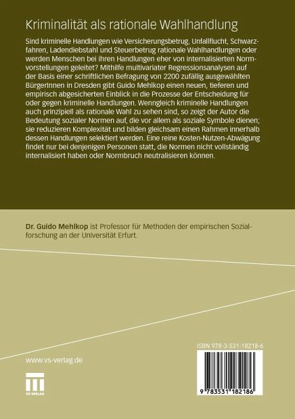 Sind kriminelle Handlungen wie Versicherungsbetrug, Unfallflucht, Schwarzfahren, Ladendiebstahl und Steuerbetrug rationale Wahlhandlungen oder werden Menschen bei ihren Handlungen eher von internalisierten Normvorstellungen geleitet? Mithilfe multivariater Regressionsanalysen auf der Basis einer schriftlichen Befragung von 2200 zufällig ausgewählten BürgerInnen in Dresden gibt Guido Mehlkop einen neuen, tieferen und empirisch abgesicherten Einblick in die Prozesse der Entscheidung für oder gegen kriminelle Handlungen. Wenngleich kriminelle Handlungen auch prinzipiell als rationale Wahl zu sehen sind, so zeigt der Autor die Bedeutung sozialer Normen auf, die vor allem als soziale Symbole dienen;