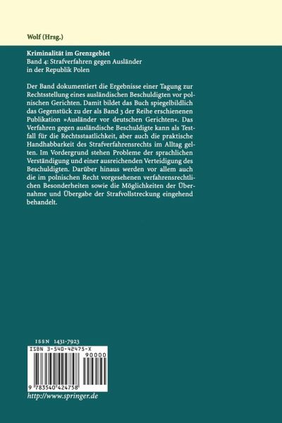 Ausländerkriminalität in Polen.- Auszüge aus der Diskussion.- Geltungsbereich des polnischen Strafrechts gegenüber Ausländern.- Auszüge aus der Diskussion.- Zwangsmittel im Strafverfahren gegen Ausländer.- Auszüge aus der Diskussion.- Rechtshilfe und Zustellungen im Strafverfahren gegen Ausländer.- Auszüge aus der Diskussion.- Übergabe und Übernahme der Strafverfolgung.- Auszüge aus der Diskussion.- Die Verhandlung in Abwesenheit des angeklagten Ausländers.- Auszüge aus der Diskussion.- Besondere Verfahrenstypen gegen Ausländer im System des polnischen Strafverfahrens.- Auszüge aus der Diskussion.- Das Recht des Ausländers auf Verteidigung.- Auszüge aus der Diskussion.- Die Teilnahme des Verteidigers und des Bevollmächtigten aus einem anderen Land am Strafverfahren in Polen.- Auszüge aus der Diskussion.- Das Recht auf einen Dolmetscher bzw. Übersetzer im Strafverfahren.- Auszüge aus der Diskussion.- Sprachliche Aspekte der Kommunikation mit Ausländern im Strafverfahren.- Auszüge aus der Diskussion.- Die Verhängung von Strafen und anderen Maßnahmen gegen Ausländer.- Auszüge aus der Diskusssion.- Die Vollstreckung von Strafen und Strafmitteln gegenüber Ausländern in Polen.- Auszüge aus der Diskussion.- Verzeichnis der Referenten.