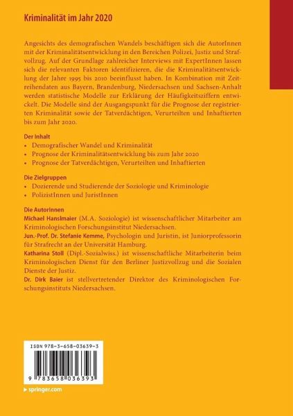 Angesichts des demografischen Wandels beschäftigen sich die AutorInnen mit der Kriminalitätsentwicklung in den Bereichen Polizei, Justiz und Strafvollzug. Auf der Grundlage zahlreicher Interviews mit ExpertInnen lassen sich die relevanten Faktoren identifizieren, die die Kriminalitätsentwicklung der Jahre 1995 bis 2010 beeinflusst haben. In Kombination mit Zeitreihendaten aus Bayern, Brandenburg, Niedersachsen und Sachsen-Anhalt werden statistische Modelle zur Erklärung der Häufigkeitsziffern entwickelt. Die Modelle sind der Ausgangspunkt für die Prognose der registrierten Kriminalität sowie der Tatverdächtigen, Verurteilten und Inhaftierten bis zum Jahr 2020.