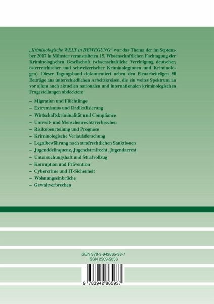 ¿Kriminologische WELT in BEWEGUNG¿ war das Thema der im September 2017 in Münster veranstalteten 15. Wissenschaftlichen Fachtagung der Kriminologischen Gesellschaft (wissenschaftliche Vereinigung deutscher, österreichischer und schweizerischer Kriminologinnen und Kriminologen). Dieser Tagungsband dokumentiert neben den Plenarbeiträgen 50 Beiträge aus unterschiedlichen Arbeitskreisen, die ein weites Spektrum an vor allem auch aktuellen nationalen und internationalen kriminologischen Fragestellungen abdeckten: Migration und Flüchtlinge / Extremismus und Radikalisierung / Wirtschaftskriminalität und Compliance / Umwelt- und Menschenrechtsverbrechen / Risikobeurteilung und Prognose / Kriminologische Verlaufsforschung / Legalbewährung nach strafrechtlichen Sanktionen / Jugenddelinquenz, Jugendstrafrecht, Jugendarrest / Untersuchungshaft und Strafvollzug / Korruption und Prävention / Cybercrime und IT-Sicherheit / Wohnungseinbrüche / Gewaltverbrechen