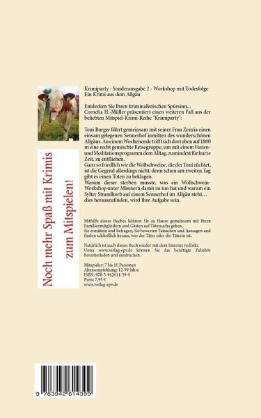 Krimiparty - Sonderausgabe 2 - Workshop mit Todesfolge. Ein Krimi aus dem Allgäu. Entdecken Sie Ihren kriminalistischen Spürsinn... Cornelia H.-Müller präsentiert einen weiteren Fall aus der beliebten Mitspiel-Krimi-Reihe "Krimiparty": Toni Burger führt gemeinsam mit seiner Frau Zenzia einen einsam gelegenen Sennerhof inmitten des wunderschönen Allgäus. An einem Wochenende trifft sich dort oben auf 1800 m eine recht gemischte Reisegruppe, um mit einem Fasten- und Meditationsprogramm dem Alltag, zumindest für kurze Zeit, zu entfliehen. Ganz so friedlich wie die Wollschweine, die der Toni züchtet, ist die Gegend allerdings nicht, denn schon am zweiten Tag gibt es einen Toten zu beklagen. Warum dieser sterben musste, was ein Wollschwein-Workshop unter Männern damit zu tun hat und warum ein Sylter Strandkorb auf einem Sennerhof im Allgäu steht¿ dies herauszufinden, wird Ihre Aufgabe sein. Mithilfe dieses Buches können Sie zu Hause gemeinsam mit Ihren Familienmitgliedern und Gästen auf Tätersuche gehen. Sie ermitteln und befragen, Sie bewerten Tatsachen und Aussagen und finden schließlich heraus, wer der Täter oder die Täterin ist. Natürlich ist auch dieses Buch wieder mit dem Internet verlinkt. Unter www.verlag-epv.de können Sie das benötigte Zubehör herunterladen und ausdrucken. Mitspieler: 7 bis 10 Personen, Altersempfehlung: 12-99 Jahre.