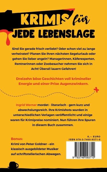 Ingrid Werner hat in dieser Anthologie 13 kleine Kriminalgeschichten für Jeden und jede Lebenslage zusammengefasst. Bis auf eine Geschichte, die Peter Goldner beigesteuert hat, stammen alle Geschichten aus ihrer Feder und wurden schon in anderen Anthologien