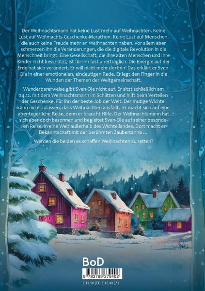 Der Weihnachtsmann hat keine Lust mehr auf Weihnachten. Keine Lust auf Weihnachts-Geschenke-Marathon. Keine Lust auf Menschen, die auch keine Freude mehr an Weihnachten haben. Vor allem aber schmerzen ihn die Veränderungen, die die digitale Revolution in die Menschheit bringt. Eine Gesellschaft, die ihre alten Menschen und ihre Kinder nicht beschützt, ist für ihn fast unerträglich. Die Energie auf der Erde hat sich verändert. Er will nicht mehr dorthin! Das erklärt er Sven-Ole in einer emotionalen, eindeutigen Rede. Er legt den Finger in die Wunden der Themen der Weltgemeinschaft. Wunderbarerweise gibt Sven-Ole nicht auf. Er sitzt schließlich am 24.12. mit dem Weihnachtsmann im Schlitten und hilft beim Verteilen der Geschenke. Für ihn der beste Job der Welt. Der mutige Wichtel kann nicht zulassen, dass Weihnachten ausfällt. Er macht sich auf eine abenteuerliche Reise, denn er braucht Hilfe. Der Weihnachtsmann hat sich aber doch besonnen und begleitet Sven-Ole auf seiner besonderen Reise, in eine Welt außerhalb des Wichtellandes. Dort macht er Bekanntschaft mit der berühmten Zaubertanne..... .Werden die Beiden es schaffen Weihnachten zu retten?