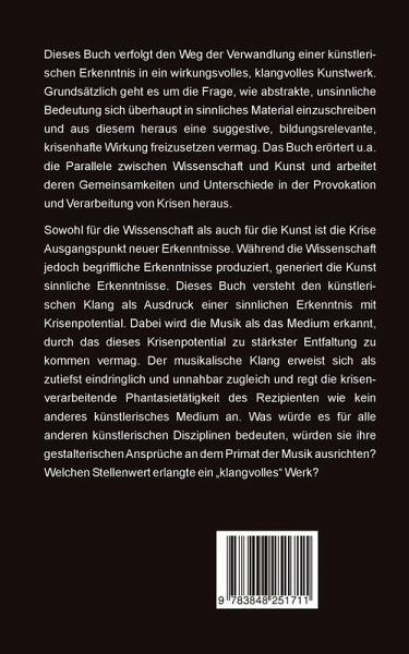 Dieses Buch verfolgt den Weg der Verwandlung einer künstlerischen Erkenntnis in ein wirkungsvolles, klangvolles Kunstwerk. Grundsätzlich geht es um die Frage, wie abstrakte, unsinnliche Bedeutung sich überhaupt in sinnliches Material einzuschreiben und aus diesem heraus eine suggestive, bildungsrelevante, krisenhafte Wirkung freizusetzen vermag. Das Buch erörtert u.a. die Parallele zwischen Wissenschaft und Kunst und arbeitet deren Gemeinsamkeiten und Unterschiede in der Provokation und Verarbeitung von Krisen heraus. Sowohl für die Wissenschaft als auch für die Kunst ist die Krise Ausgangspunkt neuer Erkenntnisse. Während die Wissenschaft jedoch begriffliche Erkenntnisse produziert, generiert die Kunst sinnliche Erkenntnisse. Dieses Buch versteht den künstlerischen Klang als Ausdruck einer sinnlichen Erkenntnis mit Krisenpotential. Dabei wird die Musik als das Medium erkannt, durch das dieses Krisenpotential zu stärkster Entfaltung zu kommen vermag. Der musikalische Klang erweist sich als zutiefst eindringlich und unnahbar zugleich und regt die krisenverarbeitende Phantasietätigkeit des Rezipienten wie kein anderes künstlerisches Medium an. Was würde es für alle anderen künstlerischen Disziplinen bedeuten, würden sie ihre gestalterischen Ansprüche an dem Primat der Musik ausrichten? Welchen Stellenwert erlangte ein "klangvolles" Werk?
