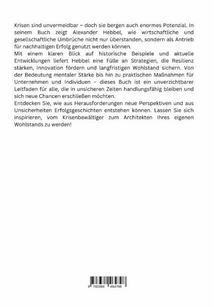 Krisen sind unvermeidbar - doch sie bergen auch enormes Potenzial. In seinem Buch zeigt Alexander Hebbel, wie wirtschaftliche und gesellschaftliche Umbrüche nicht nur überstanden, sondern als Antrieb für nachhaltigen Erfolg genutzt werden können.Mit einem klaren Blick auf historische Beispiele und aktuelle Entwicklungen liefert Heb-bel eine Fülle an Strategien, die Resilienz stärken, Innovation fördern und langfristigen Wohlstand sichern. Von der Bedeutung mentaler Stärke bis hin zu praktischen Maß-nahmen für Unternehmen und Individuen - dieses Buch ist ein unverzichtbarer Leitfaden für alle, die in unsicheren Zeiten handlungsfähig bleiben und sich neue Chancen er-schließen möchten.Entdecken Sie, wie aus Herausforderungen neue Perspektiven und aus Unsicherheiten Erfolgsgeschichten entstehen können. Lassen Sie sich inspirieren, vom Krisenbewältiger zum Architekten Ihres eigenen Wohlstands zu werden!