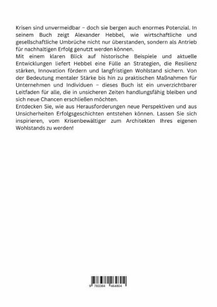 Krisen sind unvermeidbar - doch sie bergen auch enormes Potenzial. In seinem Buch zeigt Alexander Hebbel, wie wirtschaftliche und gesellschaftliche Umbrüche nicht nur überstanden, sondern als Antrieb für nachhaltigen Erfolg genutzt werden können.Mit einem klaren Blick auf historische Beispiele und aktuelle Entwicklungen liefert Heb-bel eine Fülle an Strategien, die Resilienz stärken, Innovation fördern und langfristigen Wohlstand sichern. Von der Bedeutung mentaler Stärke bis hin zu praktischen Maß-nahmen für Unternehmen und Individuen - dieses Buch ist ein unverzichtbarer Leitfaden für alle, die in unsicheren Zeiten handlungsfähig bleiben und sich neue Chancen er-schließen möchten.Entdecken Sie, wie aus Herausforderungen neue Perspektiven und aus Unsicherheiten Erfolgsgeschichten entstehen können. Lassen Sie sich inspirieren, vom Krisenbewältiger zum Architekten Ihres eigenen Wohlstands zu werden!