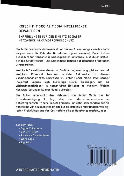 Der fortschreitende Klimawandel und dessen Auswirkungen werden dafür sorgen, dass die Zahl der Naturkatastrophen zunimmt. Daher ist es besonders für Menschen in Krisengebieten notwendig, sich durch umfassendes Katastrophen- und Krisenmanagement auf derartige Situationen vorzubereiten.Welche Informationssysteme zur Bevölkerungswarnung gibt es bereits? Welches Potenzial besitzen soziale Netzwerke in diesem Zusammenhang? Was verstehen wir unter Social Media Intelligence? inwieweit können sich freiwillige Helfer einbringen, um die Widerstandsfähigkeit in humanitären Notlagen zu steigern. Welche Herausforderungen können dabei auftreten?Der Autor untersucht den Mehrwert von Social Media bei der Krisenbewältigung. Er legt dar, wie Informationssysteme im Katastrophenschutz zum Einsatz kommen und geht insbesondere auf die Potenziale von sozialen Medien ein. Für die effektive Koordination von digitalen Freiwilligen und Vor-Ort-Helfern gibt er Handlungsempfehlungen. Aus dem Inhalt:-Digital Volunteers;-Vor-Ort-Helfer;-Facebook Disaster Maps;-Warn-Apps;-Big Data