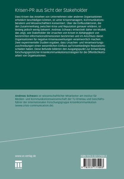 Dass Krisen das Ansehen von Unternehmen oder anderen Organisationen erheblich beschädigen können, ist unter Krisenmanagern, Kommunikationsberatern und Wissenschaftlern konsentiert. Über die Einflussfaktoren, die den Zusammenhang zwischen Krise und Reputation genauer erklären, ist bislang jedoch wenig bekannt. Andreas Schwarz entwickelt daher ein Modell, das zeigt, wie Stakeholder die Ursachen von Krisen in Abhängigkeit von bestimmten Informationsdimensionen bestimmen und im Anschluss daran Organisationen für negative Krisenauswirkungen verantwortlich machen. Zwei experimentelle Studien ergaben, dass Ursachen- und Verantwortungszuschreibungen einen wesentlichen Einfluss auf krisenbedingte Reputationsschäden haben. Diese Befunde bildeten den Ausgangspunkt zur Entwicklung forschungsgestützter Krisenkommunikationsstrategien für die Öffentlichkeitsarbeit von Organisationen.