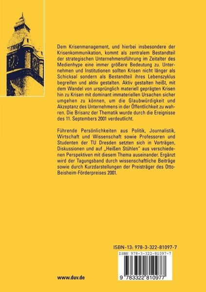 Dem Krisenmanagement, und hierbei insbesondere der Krisenkommunikation, kommt als zentralem Bestandteil der strategischen Unternehmensführung im Zeitalter des Medienhype eine immer größere Bedeutung zu. Unternehmen und Institutionen sollten Krisen nicht länger als Schicksal sondern als Bestandteil ihres Lebenszyklus begreifen und aktiv gestalten. Aktiv gestalten heißt, mit dem Wandel von ursprünglich materiell geprägten Krisen hin zu Krisen mit dominant immateriellen Ursachen sicher umgehen zu können, um die Glaubwürdigkeit und Akzeptanz des Unternehmens in der Öffentlichkeit zu wahren. Die Brisanz der Thematik wurde durch die Ereignisse des 11. Septembers 2001 verdeutlicht.