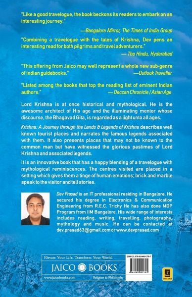 Lord Krishna is at once historical and mythological. He is the awesome architect of His age and the illuminating mentor whose discourse, the Bhagavad Gita, is regarded as a light unto all ages. The book Krishna: A Journey through the Lands & Legends of Krishna describes well known tourist places and narrates the famous legends associated with them. It also presents places that may not be known to a common man but have witnessed the glorious pastimes of Lord Krishna and associated legends. It is an innovative book that has a happy blending of a travelogue with mythological reminiscences. The centres visited are placed in a setting which gives them a tinge of human emotions; brick and marble speak to the visitor and tell stories. The past and the present mingle, and the visit becomes a memorable experience.