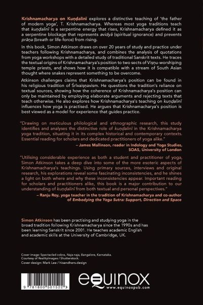 Krishnamacharya on Kü¿alin¿ explores a distinctive teaching of 'the father of modern yoga', T. Krishnamacharya. Whereas most yoga traditions teach that kü¿alin¿ is a serpentine energy that rises, Krishnamacharya defined it as a serpentine blockage that represents avidy¿ (spiritual ignorance) and prevents pr¿¿a (breath or life-force) from rising. In this book, Simon Atkinson draws on over 20 years of study and practice under teachers following Krishnamacharya, and combines the analysis of quotations from yoga workshops with a detailed study of traditional Sanskrit texts. He traces the textual origins of Krishnamacharya's position to two sects of Vi¿¿u-worshiping temple priests, and shows how it is compatible with a stream of South Asian thought where snakes represent something to be overcome. Atkinson challenges claims that Krishnamacharya's position can be found in his religious tradition of ¿r¿vai¿¿avism. He questions the tradition's reliance on textual sources, showing how the coherence of Krishnamacharya's position can only be maintained by employing elaborate arguments and rejecting texts that teach otherwise. He also explores how Krishnamacharya's teaching on kü¿alin¿ influences how yoga is practised. He argues that Krishnamacharya's position is best viewed as a model for experience that guides practice.