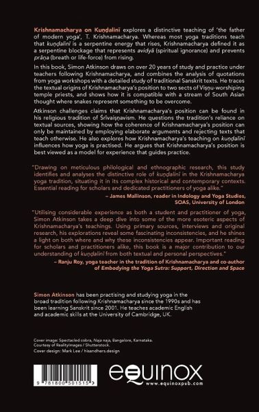 Krishnamacharya on Kü¿alin¿ explores a distinctive teaching of 'the father of modern yoga', T. Krishnamacharya. Whereas most yoga traditions teach that kü¿alin¿ is a serpentine energy that rises, Krishnamacharya defined it as a serpentine blockage that represents avidy¿ (spiritual ignorance) and prevents pr¿¿a (breath or life-force) from rising. In this book, Simon Atkinson draws on over 20 years of study and practice under teachers following Krishnamacharya, and combines the analysis of quotations from yoga workshops with a detailed study of traditional Sanskrit texts. He traces the textual origins of Krishnamacharya's position to two sects of Vi¿¿u-worshiping temple priests, and shows how it is compatible with a stream of South Asian thought where snakes represent something to be overcome. Atkinson challenges claims that Krishnamacharya's position can be found in his religious tradition of ¿r¿vai¿¿avism. He questions the tradition's reliance on textual sources, showing how the coherence of Krishnamacharya's position can only be maintained by employing elaborate arguments and rejecting texts that teach otherwise. He also explores how Krishnamacharya's teaching on kü¿alin¿ influences how yoga is practised. He argues that Krishnamacharya's position is best viewed as a model for experience that guides practice.