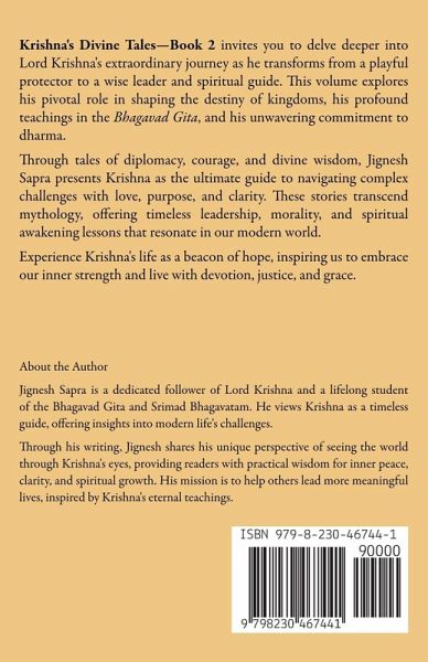 Krishna's Divine Tales-Book 2 invites you to delve deeper into Lord Krishna's extraordinary journey as he transforms from a playful protector to a wise leader and spiritual guide. This volume explores his pivotal role in shaping the destiny of kingdoms, his profound teachings in the Bhagavad Gita, and his unwavering commitment to dharma. Through tales of diplomacy, courage, and divine wisdom, Jignesh Sapra presents Krishna as the ultimate guide to navigating complex challenges with love, purpose, and clarity. These stories transcend mythology, offering timeless leadership, morality, and spiritual awakening lessons that resonate in our modern world. Experience Krishna's life as a beacon of hope, inspiring us to embrace our inner strength and live with devotion, justice, and grace.