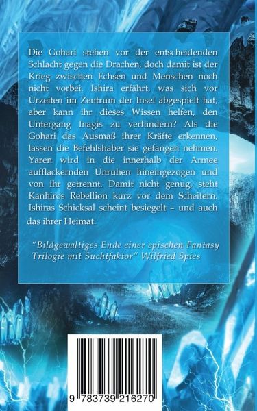 Die Gohari stehen vor der entscheidenden Schlacht gegen die Drachen, doch damit ist der Krieg zwischen Echsen und Menschen noch nicht vorbei. Ishira erfährt, was sich vor Urzeiten im Zentrum der Insel abgespielt hat, aber kann ihr dieses Wissen helfen, den Untergang Inagis zu verhindern? Als die Gohari das Ausmaß ihrer Kräfte erkennen, lassen die Befehlshaber sie gefangen nehmen. Yaren wird in die innerhalb der Armee aufflackernden Unruhen hineingezogen und von ihr getrennt. Damit nicht genug, steht Kanhiros Rebellion kurz vor dem Scheitern. Ishiras Schicksal scheint besiegelt - und auch das ihrer Heimat."Bildgewaltiges Ende einer epischen Fantasy Trilogie mit Suchtfaktor." Wilfried Spies"Großartig; ganz großer Lesegenuss!!!" Kurrer auf Amazon.de"Fulminantes Ende, das einen bis zuletzt in Atem hält." Antonia Günder-Freytag auf Amazon.de