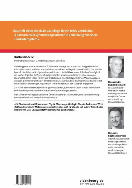 Modellbaubögen in sieben Farben (pro Kristallsystem eine Farbe) bieten die Möglichkeit, 3-dimensionale Körper, auf denen alle Symmetrieelemente eingezeichnet sind, selbst zusammenzubauen. Eine kurze Einführung, eine übersichtliche Tabelle der 32 Kristallklassen sowie ein Lernkartensystem komplettieren das Heft.