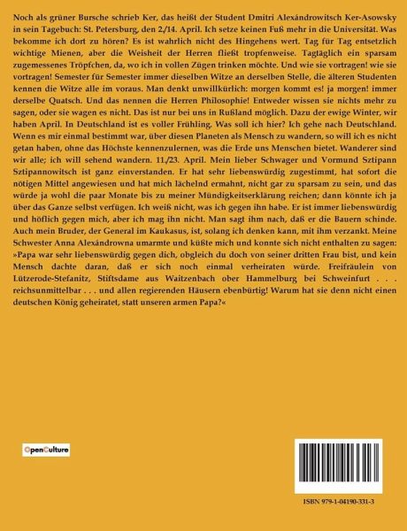 Noch als grüner Bursche schrieb Ker, das heißt der Student Dmitri Alexándrowitsch Ker-Asowsky in sein Tagebuch: St. Petersburg, den 2./14. April. Ich setze keinen Fuß mehr in die Universität. Was bekomme ich dort zu hören? Es ist wahrlich nicht des Hingehens wert. Tag für Tag entsetzlich wichtige Mienen, aber die Weisheit der Herren fließt tropfenweise. Tagtäglich ein sparsam zugemessenes Tröpfchen, da, wo ich in vollen Zügen trinken möchte. Und wie sie vortragen! wie sie vortragen! Semester für Semester immer dieselben Witze an derselben Stelle, die älteren Studenten kennen die Witze alle im voraus. Man denkt unwillkürlich: morgen kommt es! ja morgen! immer derselbe Quatsch. Und das nennen die Herren Philosophie! Entweder wissen sie nichts mehr zu sagen, oder sie wagen es nicht. Das ist nur bei uns in Rußland möglich. Dazu der ewige Winter, wir haben April. In Deutschland ist es voller Frühling. Was soll ich hier? Ich gehe nach Deutschland. Wenn es mir einmal bestimmt war, über diesen Planeten als Mensch zu wandern, so will ich es nicht getan haben, ohne das Höchste kennenzulernen, was die Erde uns Menschen bietet. Wanderer sind wir alle; ich will sehend wandern. 11./23. April. Mein lieber Schwager und Vormund Sztipann Sztipannowitsch ist ganz einverstanden. Er hat sehr liebenswürdig zugestimmt, hat sofort die nötigen Mittel angewiesen und hat mich lächelnd ermahnt, nicht gar zu sparsam zu sein, und das würde ja wohl die paar Monate bis zu meiner Mündigkeitserklärung reichen; dann könnte ich ja über das Ganze selbst verfügen. Ich weiß nicht, was ich gegen ihn habe. Er ist immer liebenswürdig und höflich gegen mich, aber ich mag ihn nicht. Man sagt ihm nach, daß er die Bauern schinde. Auch mein Bruder, der General im Kaukasus, ist, solang ich denken kann, mit ihm verzankt. Meine Schwester Anna Alexándrowna umarmte und küßte mich und konnte sich nicht enthalten zu sagen: »Papa war sehr liebenswürdig gegen dich, obgleich du doch von seiner dritten Frau bist, und kein Mensch dachte daran, daß er sich noch einmal verheiraten würde. Freifräulein von Lützerode-Stefanitz, Stiftsdame aus Waitzenbach ober Hammelburg bei Schweinfurt . . . reichsunmittelbar . . . und allen regierenden Häusern ebenbürtig! Warum hat sie denn nicht einen deutschen König geheiratet, statt unseren armen Papa?«