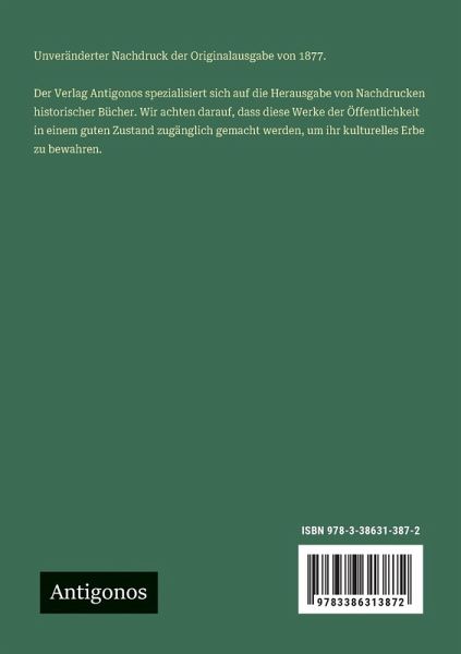 Unveränderter Nachdruck der Originalausgabe von 1877. Der Verlag Antigonos spezialisiert sich auf die Herausgabe von Nachdrucken historischer Bücher. Wir achten darauf, dass diese Werke der Öffentlichkeit in einem guten Zustand zugänglich gemacht werden, um ihr kulturelles Erbe zu bewahren.