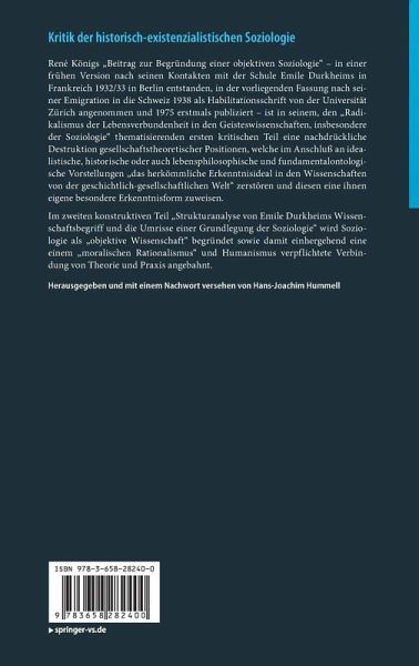 René Königs "Beitrag zur Begründung einer objektiven Soziologie" - in einer frühen Version nach seinen Kontakten mit der Schule Emile Durkheims in Frankreich 1932/33 in Berlin entstanden, in der vorliegenden Fassung nach seiner Emigration in die Schweiz 1938 als Habilitationsschrift von der Universität Zürich angenommen und 1975 erstmals publiziert - ist in seinem, den "Radikalismus der Lebensverbundenheit in den Geisteswissenschaften, insbesondere der Soziologie" thematisierenden ersten kritischen Teil eine nachdrückliche Destruktion gesellschaftstheoretischer Positionen, welche im Anschluß an idealistische, historische oder auch lebensphilosophische und fundamentalontologische Vorstellungen "das herkömmliche Erkenntnisideal in den Wissenschaften von der geschichtlich-gesellschaftlichen Welt" zerstören und diesen eine ihnen eigene besondere Erkenntnisform zuweisen.