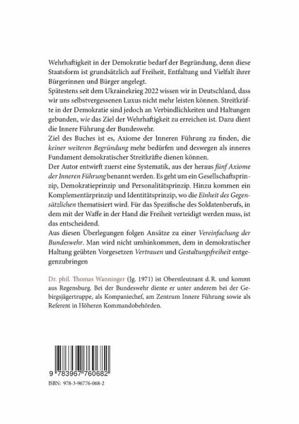 Wehrhaftigkeit in der Demokratie bedarf der Begründung, denn diese Staatsform ist grundsätzlich auf Freiheit, Entfaltung und Vielfalt ihrer Bürgerinnen und Bürger angelegt. Spätestens seit dem Ukrainekrieg 2022 wissen wir in Deutschland, dass wir uns selbstvergessenen Luxus nicht mehr leisten können. Streitkräfte in der Demokratie sind jedoch an Verbindlichkeiten und Haltungen gebunden, wie das Ziel der Wehrhaftigkeit zu erreichen ist. Dazu dient die Innere Führung der Bundeswehr. Ziel des Buches ist es, Axiome der Inneren Führung zu finden, die keiner weiteren Begründung mehr bedürfen und deswegen als inneres Fundament demokratischer Streitkräfte dienen können. Der Autor entwirft zuerst eine Systematik, aus der heraus fünf Axiome der Inneren Führung benannt werden. Es geht um ein Gesellschaftsprinzip, Demokratieprinzip und Personalitätsprinzip. Hinzu kommen ein Komplementärprinzip und Identitätsprinzip, wo die Einheit des Gegensätzlichen thematisiert wird. Für das Spezifische des Soldatenberufs, in dem mit der Waffe in der Hand die Freiheit verteidigt werden muss, ist das entscheidend. Aus diesen Überlegungen folgen Ansätze zu einer Vereinfachung der Bundeswehr. Man wird nicht umhinkommen, dem in demokratischer Haltung geübten Vorgesetzen Vertrauen und Gestaltungsfreiheit entgegenzubringen.