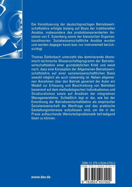 Thomas Diefenbach unterzieht das dominierende ökonomisch-technische Wissenschaftsprogramm der Betriebswirtschaftslehre einer grundsätzlichen Kritik und weist nach, dass eine Konzeption der Allgemeinen Betriebswirtschaftslehre auf einer sozialwissenschaftlichen Basis sowohl möglich als auch notwendig ist. Neben allgemeinen Annahmen über den Betrieb generiert der Autor ein Modell zur Erfassung und Beschreibung von Betrieben basierend auf dem methodologischen Individualismus und Strukturalismus sowie auf Ansätzen der integrativen Managementlehre. Schließlich legt er dar, wie bei der Einordnung der Betriebswirtschaftslehre als empirischer Sozialwissenschaft die Wertfrage und das praktische Gestaltungsinteresse aufzufassen sind, um die in der Praxis auftauchende Werturteilsproblematik befriedigend lösen zu können.
