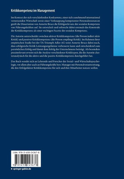 Im Kontext der sich verschärfenden Konkurrenz, einer sich zunehmend international vernetzenden Wirtschaft sowie einer Verknappung kompetenter Personalressourcen greift die Dissertation von Annette Bruce die Erfolgsrelevanz der sozialen Kompetenz von Führungskräften auf. Sie entwickelt und erforscht dabei erstmals das Konstrukt der Kritikkompetenz als einer wichtigen Facette der sozialen Kompetenz.