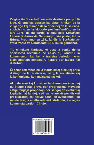 Origine tiu ¿i skribäo ne estis destinita por publi-kigo. ¿i entenas detalan kaj akran kritikon de la vulgarigo kaj diluado de la principoj de la scienca socialismo en la klopodo por kunfandi¿o, en la jaro 1875, de du partioj al unu sola Socialista Laborista Partio de Germanujo, kiu poste, lä la Erfurta Programo, en 1991 fari¿is la Socialdemokrata Partio de Germanujo (SPD lä la germana). Tiu ¿i teksto klarigas, ke post la venko de la socialisma revolucio ne eblas tuj konstrui la komunismon kaj ke la transira periodo havas siajn apartajn kondi¿ojn, iteralie por laboro kaj distribuo. ¿i estas referenco en la marksismaj diskutoj pri la distingo de la du diversaj fazoj, la socialisma kaj la komunisma, kun malsamaj taskoj. Aktuale koni kaj konsideri la diferencon inter tiuj du ¿tupoj estas grava por progresemaj movadoj estigi tägajn proponojn por ¿an¿oj en evoluintaj kapitalismaj landoj, sed same ankä por diskuti pri okazantaj kaj sekvaj päoj en evolulando, kiu rapide levi¿is al altnivela industrilando, kie regas komunista partio - ¿inujo.